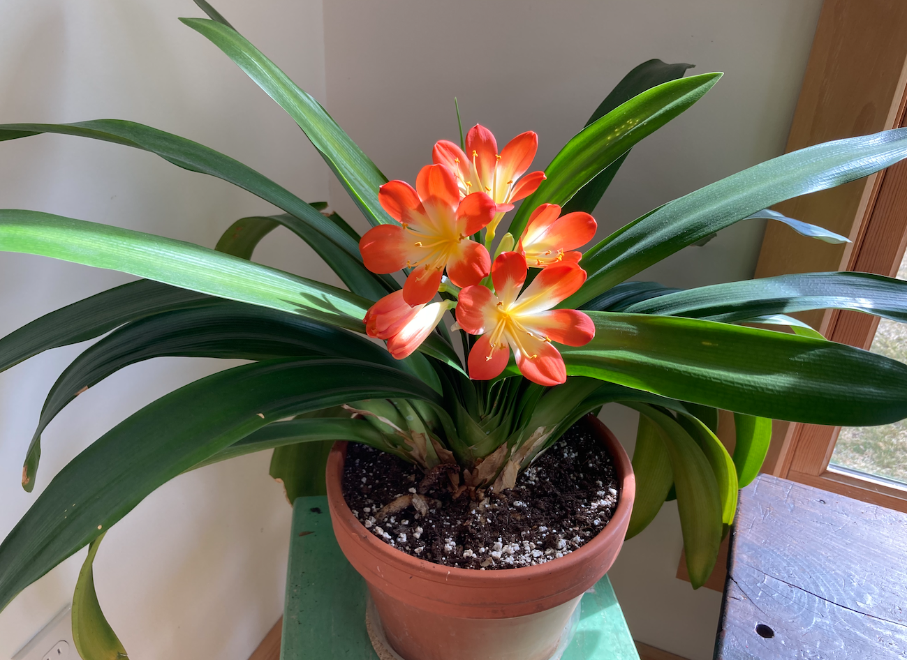 The key to getting them to bloom and extend their flower stalks, is 3 months of cold temperatures and dry conditions in fall and winter. This mimics their native climate and helps initiate better flowering. We place ours in a back bedroom that gets good natural light, but is cooler than the rest of the house. An unheated sun room could also work as long as the temperatures stay above freezing and below 60F. Like amaryllis, clivias like being root bound so don’t rush to repot them into a larger pot.